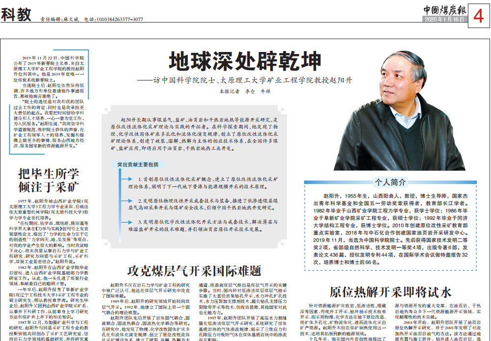 2019年11月22日,中国科学院公布了 2019 年新晋院士名单,来自国产亚洲精品美女久久久_99久无码中文字幕一本久道_亚洲成AV人影院_亚洲AV影院一区二区三区 狠狠躁夜夜躁人人爽天天不卡_国产激情久久久久影院老熟女_精品性高朝久久久久久久矿业工程学院的教授赵阳升位列其中。他是2019 年度唯一一位煤炭系统新晋院士。