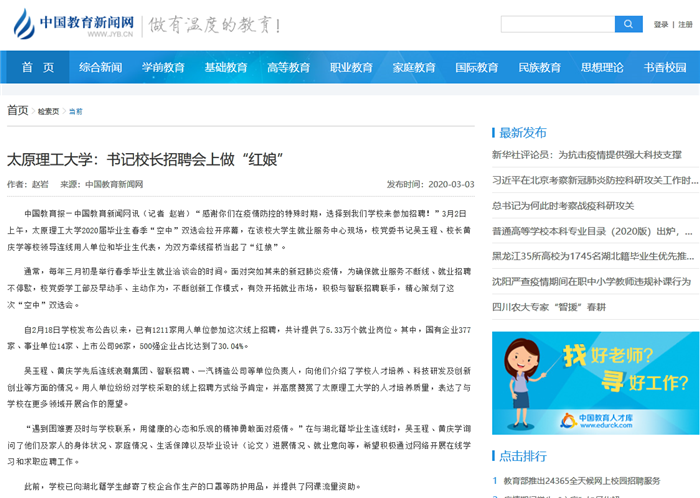 据悉,此次“空中”双选会将持续到3月15日,其间会不间断接受用人单位的报名,努力为2020届毕业生就业搭建广阔的平台。