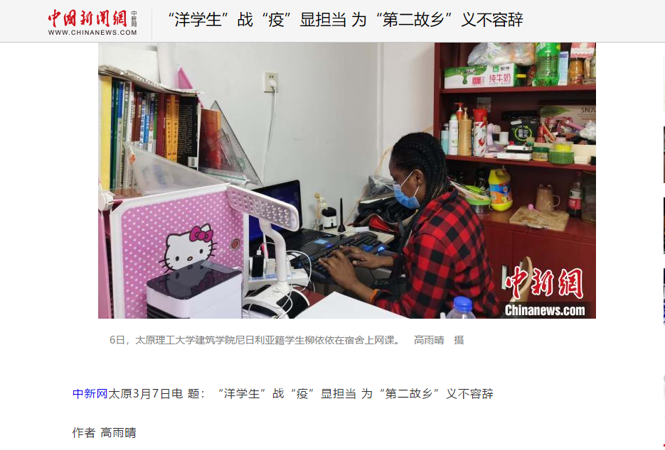 疫情期间,该校“欢动五洲”志愿者协会建立起心理支持系统,分为朋辈观察、信息共享、视频宣传、谈心谈话四组。视频宣传组成员——阿富汗籍留学生沙溢,面对疫情,主动组织国际学生录制各类正能量小视频,传播新冠肺炎防疫知识,向全世界展示当前最真实的情况。