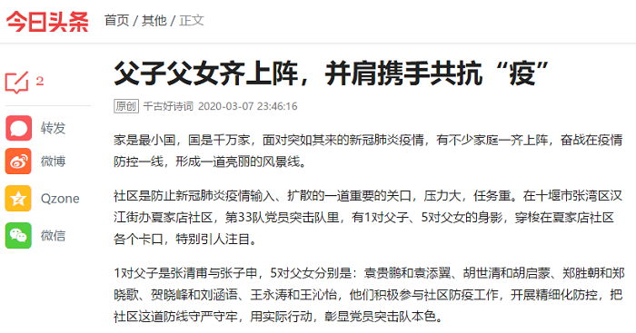 社区是防止新冠肺炎疫情输入、扩散的一道重要的关口,压力大,任务重。在十堰市张湾区汉江街办夏家店社区,第33队党员突击队里,有1对父子、5对父女的身影,穿梭在夏家店社区各个卡口,特别引人注目。