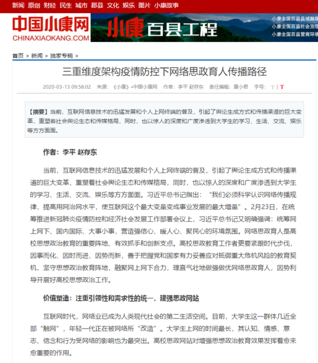 当前,互联网信息技术的迅猛发展和个人上网终端的普及,引起了舆论生成方式和传播渠道的巨大变革,重塑着社会舆论生态和传媒格局,同时,也以惊人的深度和广度渗透到大学生的学习、生活、交流、娱乐等方方面面。习近平总书记指出:“我们必须科学认识网络传播规律,提高用网治网水平,使互联网这个最大变量变成事业发展的最大增量”。2月23日,在统筹推进新冠肺炎疫情防控和经济社会发展工作部署会议上,习近平总书记又明确强调:统筹网上网下、国内国际、大事小事,营造强信心、暖人心、聚民心的环境氛围。网络思政育人是高校思想政治教育的重要阵地、有效抓手和创新支点。高校思政教育工作者更要紧跟时代步伐,因事而化、因时而进、因势而新,善于把握党和国家有力妥善应对抵御重大危机风险的教育契机,坚守思想政治教育阵地,融聚网上网下合力,理直气壮地做强做优网络思政育人,因势利导开展好高校思想政治工作。