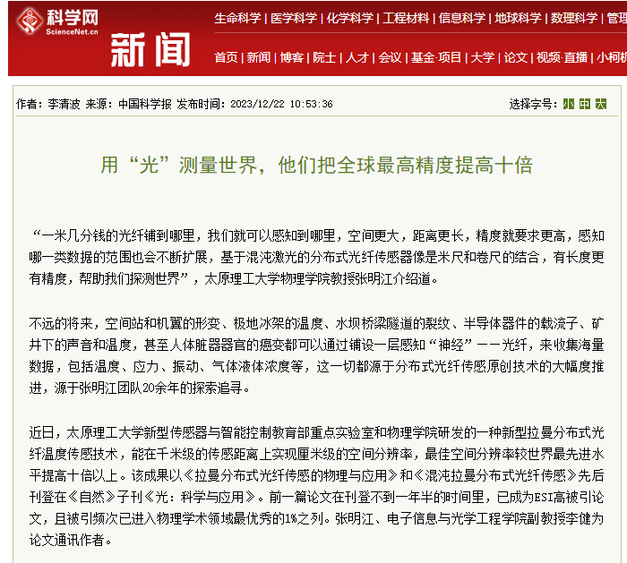 不远的将来,空间站和机翼的形变、极地冰架的温度、水坝桥梁隧道的裂纹、半导体器件的载流子、矿井下的声音和温度,甚至人体脏器器官的癌变都可以通过铺设一层感知“神经”——光纤,来收集海量数据,包括温度、应力、振动、气体液体浓度等,这一切都源于分布式光纤传感原创技术的大幅度推进,源于张明江团队20余年的探索追寻。